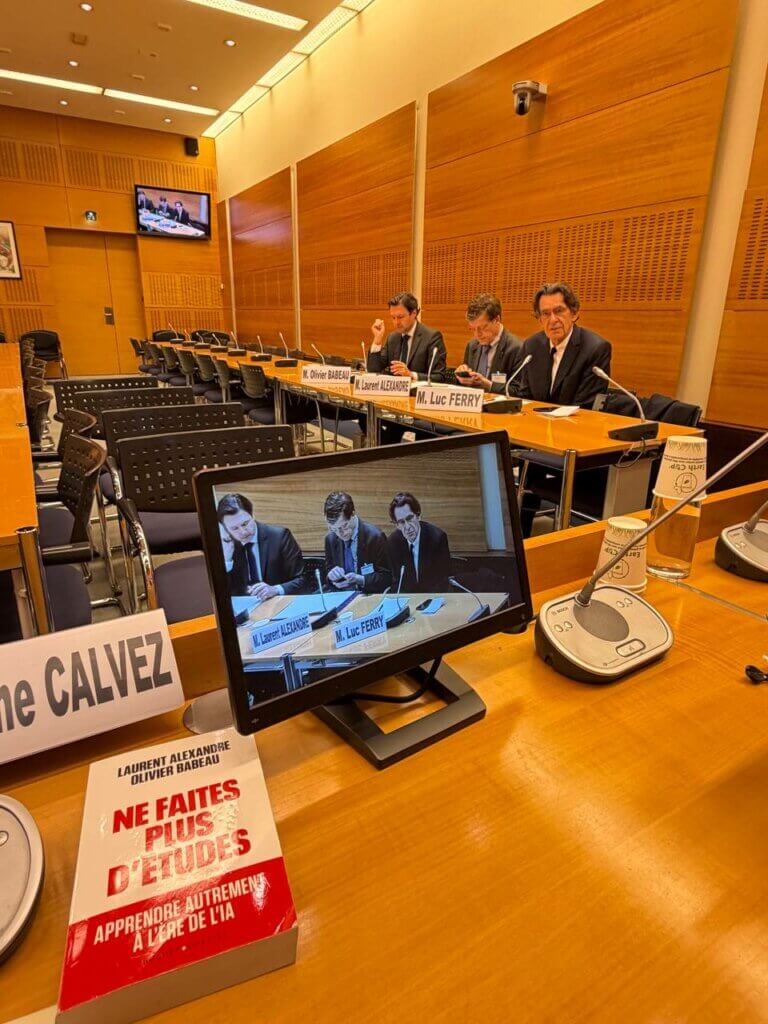 - Audition de Luc Ferry,ancien ministre de l’éducation, philosophe et auteur d’ouvrages dont IA : grand remplacement ou complémentarité ?, Olivier Babeau, co-auteur de Ne faites plus d’études ! Apprendre autrement à l’ère de l’intelligence artificielle et Laurent Alexandre , co-auteur de Ne faites plus d’études ! Apprendre autrement à l’ère de l’intelligence artificielle